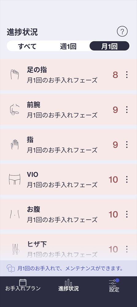 10回目の処理を終えて、すべての部位が月1回のスケジュールに移行しました